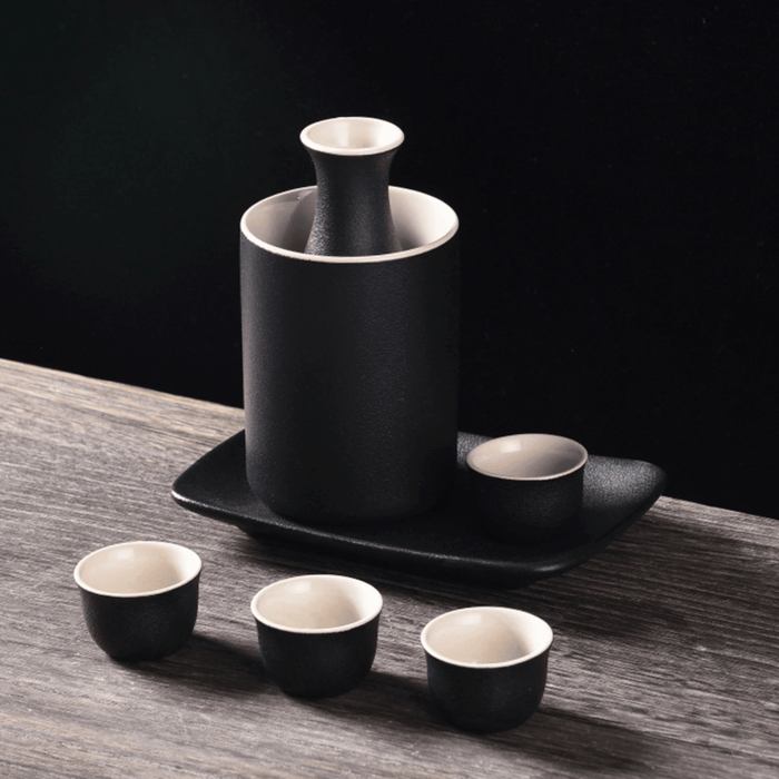 A traditional Japanese alcohol set used for serving sake, the set includes a small flask with a narrow neck and four cups, often shaped like small bowls.